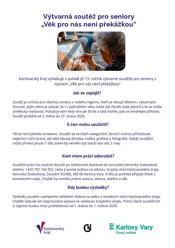Karlovarský kraj vyhlásil v pořadí již 13. ročník výtvarné soutěže pro seniory s názvem „Věk pro nás není překážkou“. Soutěž, jejímž mediálním partnerem je Český rozhlas Karlovy Vary, je určena pro všechny seniory z našeho regionu, kteří se věnují některé z výtvarných činností. Jejím cílem je ukázat, že i v pokročilém věku může být člověk stále aktivní a že se může umělecky realizovat. Přihlašovat lze nejenom ruční práce, ale také obrazy a fotografie. Příspěvky do soutěže je možné odevzdávat v termínu od 2. ledna do 27. února 2026.